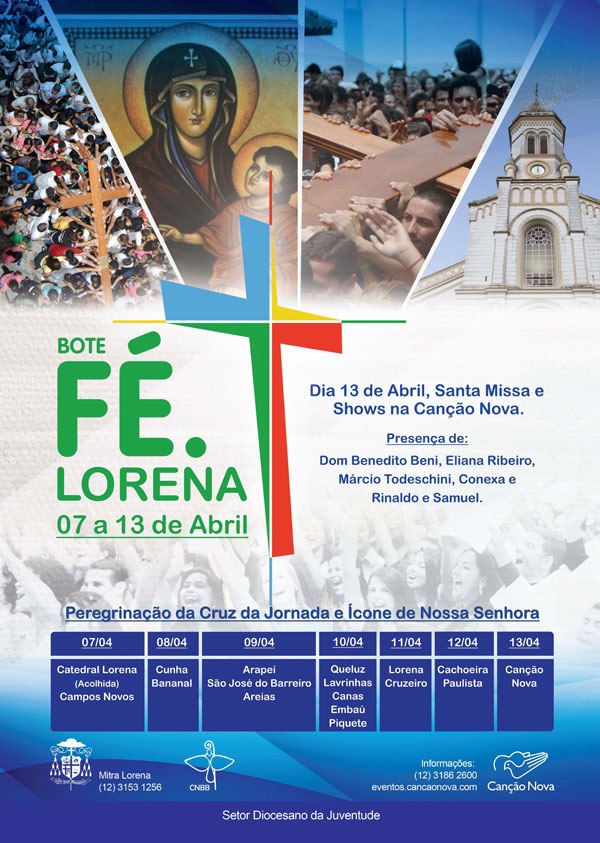 A comunidade católica Canção Nova, em Cachoeira Paulista/SP, receberá no próximo sábado (13/4) a “Cruz Peregrina” e o “Ícone de Nossa Senhora”, símbolos da Jornada Mundial da Juventude (JMJ), encerrando o ciclo de peregrinação da Diocese de Lorena/SP. Os símbolos já percorreram mais de 250 dioceses brasileiras, desde 2011, quando chegaram ao Campo de Marte, em São Paulo/SP. A chegada no Rincão do Meu Senhor, local dentro da comunidade, está prevista para as 13h.