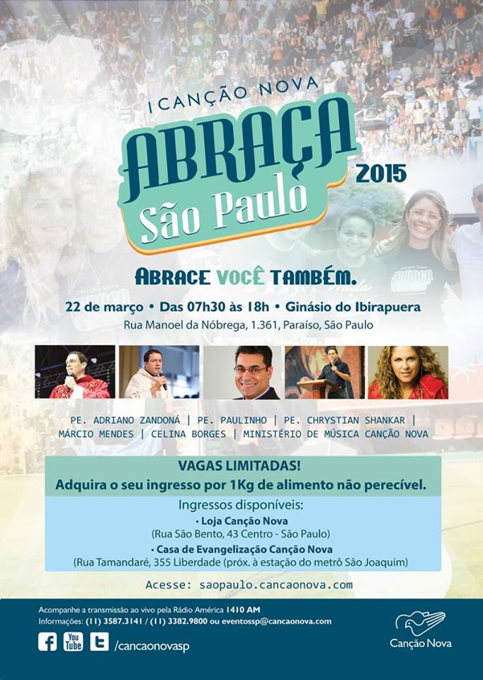 Neste domingo (22/03), a Canção Nova realiza a 4ª edição do evento “Canção Nova abraça São Paulo”, no Ginásio do Ibirapuera, com o tema “Agindo Deus, quem impedirá? (Is 43,13)” A programação tem início às 7h30 com cânticos, oração do terço, palestras, adoração ao Santíssimo Sacramento e término com a missa às 16h. A expectativa é que mais de 10 mil paulistanos participem destes momentos.